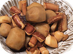 コンブだし、醤油、砂糖、酒の煮汁で適当な大きさに切ったソデイカの足を煮る。ゆでたサトイモを加える。サトイモとの相性が抜群!