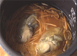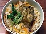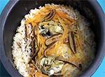 @イワガキ、細切りのニンジンと生シイタケ、ささがきゴボウを醤油味で炊き込む