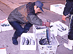 私は、35年も海に出ているが、今年は最低だね。エサが無いんだな、海に。キビナゴがいないよ。鳥もいない。鳥の下には魚がいるんだ。朝暗いうちに起きて70〜80マイルも走って、帰ってくるのが夕方の5時。サワラ2匹、合わせて3.5キロではねー。 昭和30年頃は、ここは、サンゴがよく取れたね。100匁60万円だったかな。金の3倍の値がついたな。地元船は10隻ほどで、四国からも獲りに来た。もう私らの時代ではないよ。これからは若い者に任せるよ。 |