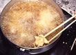 | から揚げの作り方。薄く切った足にかたくり粉をまぶし、油で揚げる |