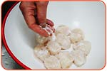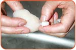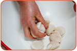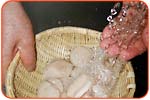 一度ざるにあげ、写真のように手で水圧をやわらげながら、貝に水をかけ、ざるを一方でふりながら洗います。 | ||