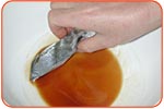 ボールにみりん、しょうゆを入れて混ぜ、サワラの身をひとつづつ入れます。 | ||