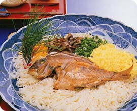 そうめんはゆでて水にとってさます、ざるにあげて水気をきり、器に盛ってタイをのせ、煮汁をかける。