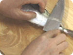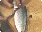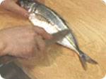 ゼイゴを取り除く。(ゼイゴは、ウロコの変形した硬い部分。) 尾の一番先から刃を入れ、頭の方へと刃を進める。ゼイゴは頭の 先までは取らない。
