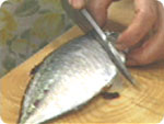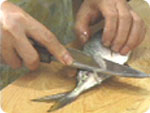 頭を右に置き、胸ビレの下から包丁を入れる。