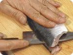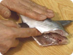 包丁の刃先まで使い切って、ひと息に身をおろしていく。