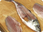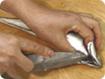 頭を右に置いて背を手前にし、包丁を大胆に切り入れて身を 切りとる。