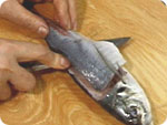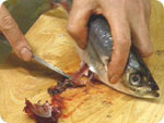 指でエラと内臓を取り出し、さらに流水で残りの内臓も きれいに取り出す。