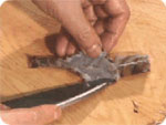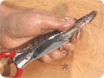 足をハサミで切り、頭の先と尾の先も切り落とします。