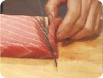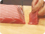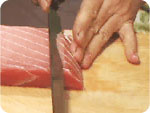 左から、刃をねかせて薄く斜めにそぎ切りにする。